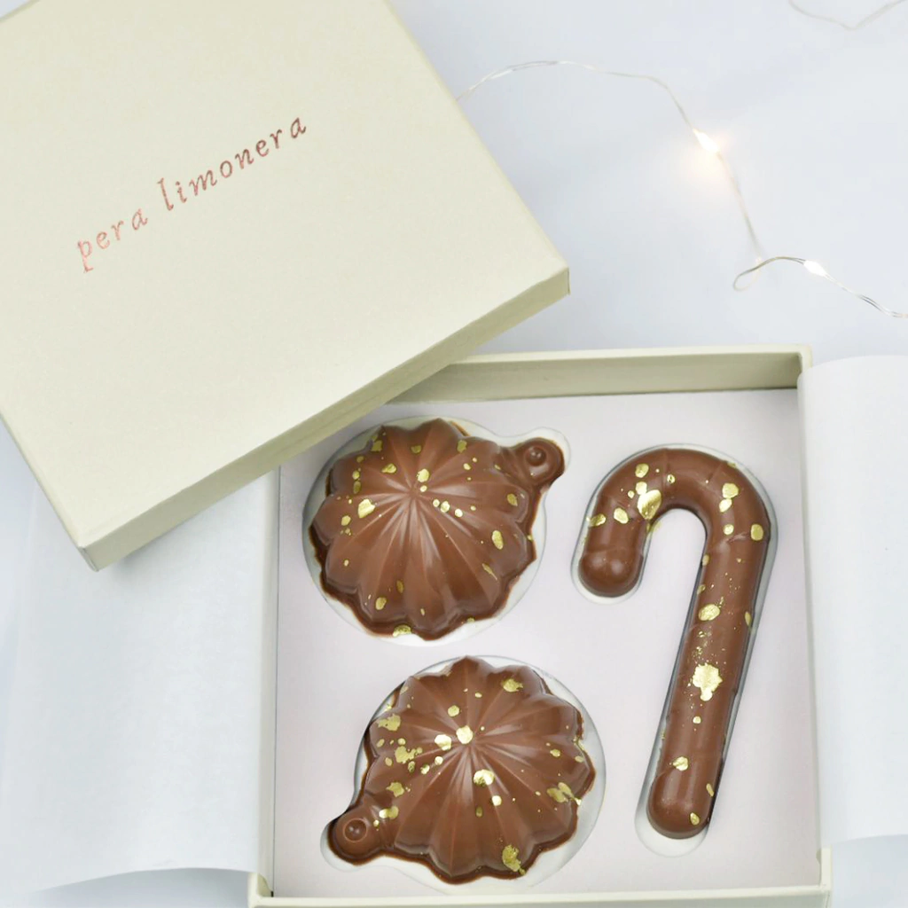 Caixa contendo 1 bengala de chocolate ao leite crocante e duas metades de bola da Natal de chocolate dark milk recheado com caramelo cremoso salgado.