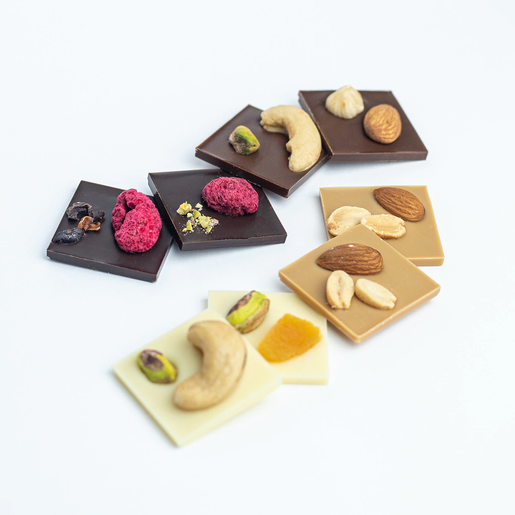 - Dark milk com pistaches, avelãs, amêndoas e castanhas de caju;