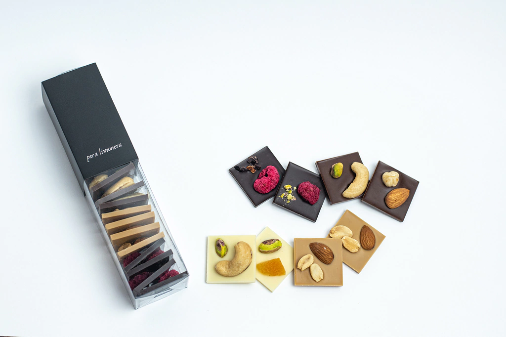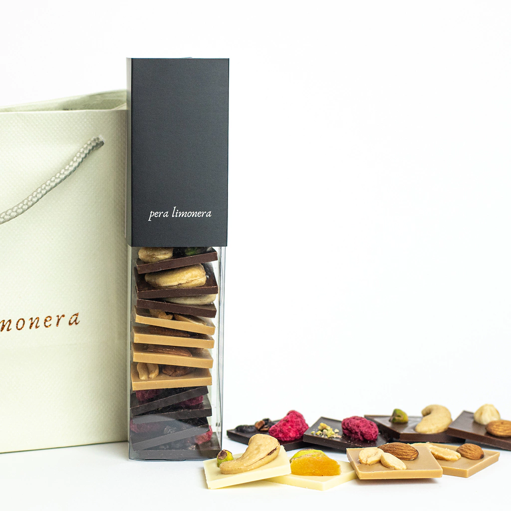 Caixa de acetato com 17 mendiants quadrados sortidos em 5 sabores: