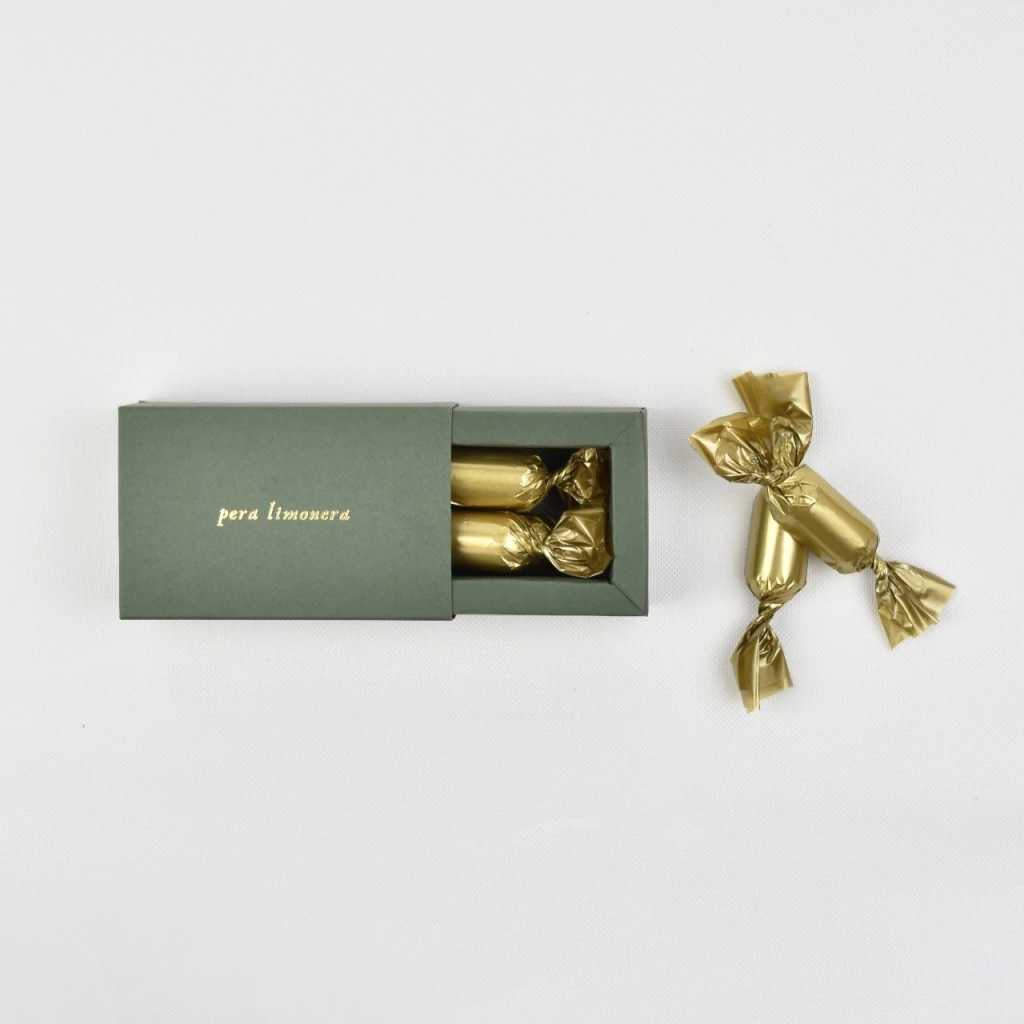 Caixa verde contendo 4 bombons gianduiotto (chocolate dark milk com avelãs) embalados individualmente no papel dourado.