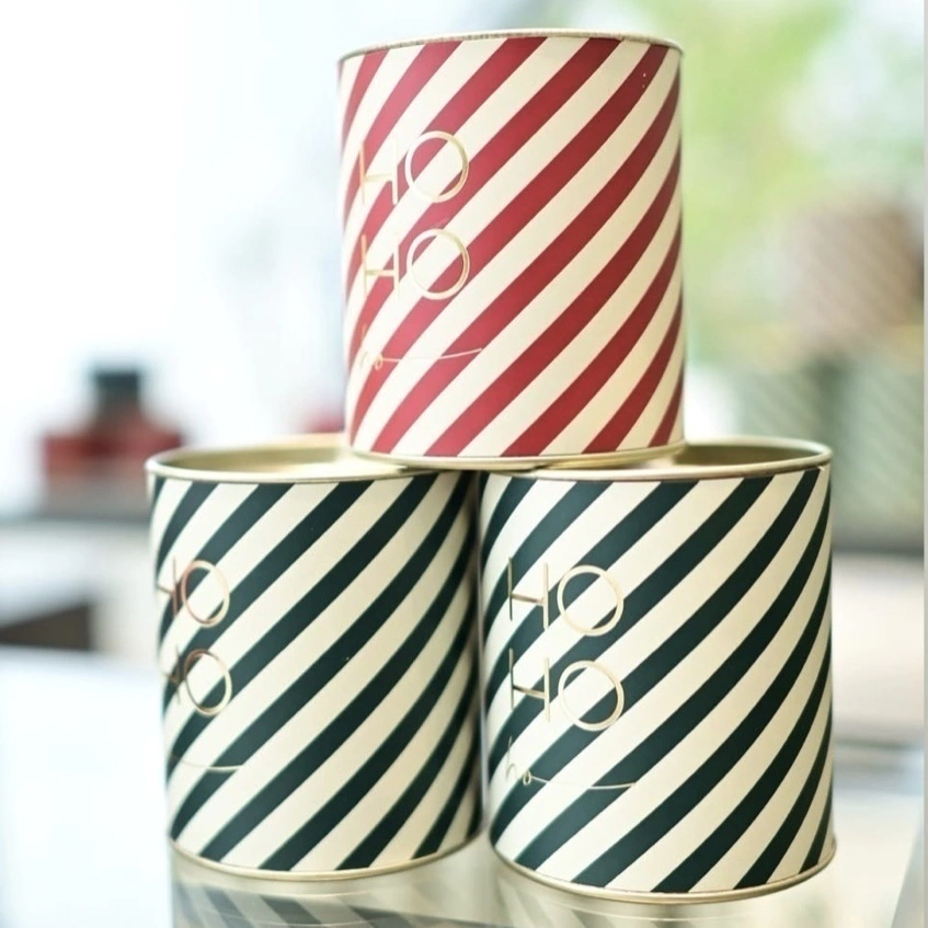 Lata pequena com estampas de Natal HO HO HO. Duas opções de conteúdo: 8 BOMBONS cocm casquinha dark milk e recheio de caramelo salgado ou CHOCOTONE BITES (pedaços de chocotone cobertos com chocolate ao leite e flor de sal). Tamanho da embalagem 8x8x8cm.